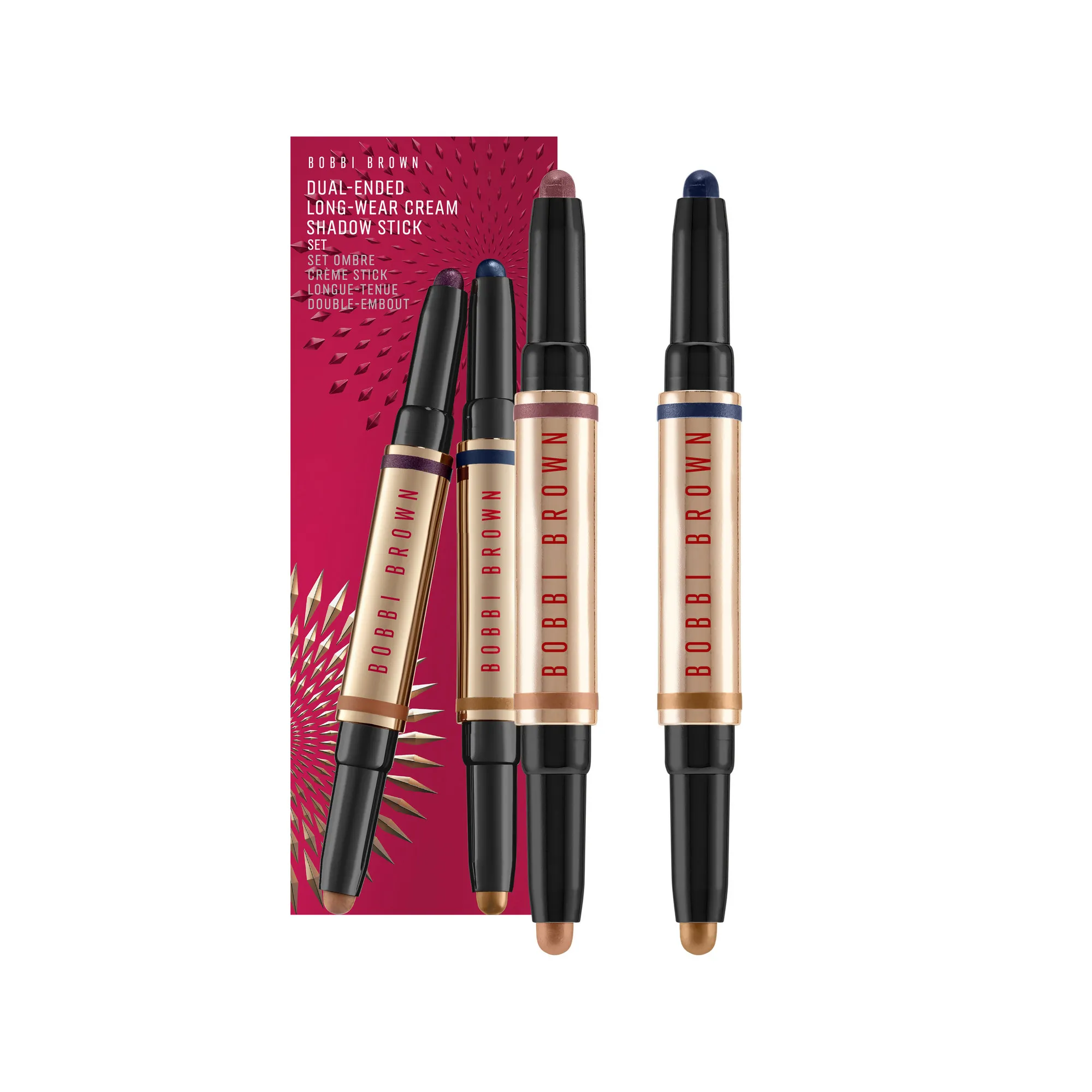 Легендарная формула кремовых теней Long-Wear Cream Shadow Stick теперь в формате двухстороннего стика! Набор включает два пары теней, оттенки которых идеально дополняют друг друга. Создавайте образы, которые будут держаться 24 часа благодаря стойкой, ультракремовой формуле, а также оттенкам, подходящим для всех тонов кожи. Благодаря роскошной лимитированной упаковке тени станут идеальным подарком или предметом для коллекционирования.