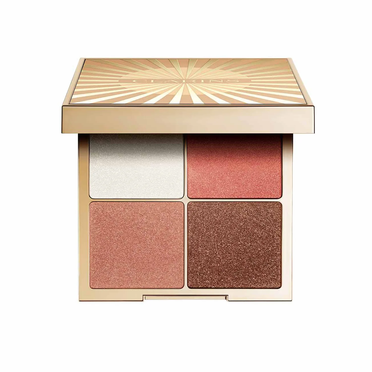Оттенки ровно ложатся и легко растушевываются, позволяя выглядеть ослепительно! Эта палитра-хайлайтер — звездный продукт летней коллекции Clarins.