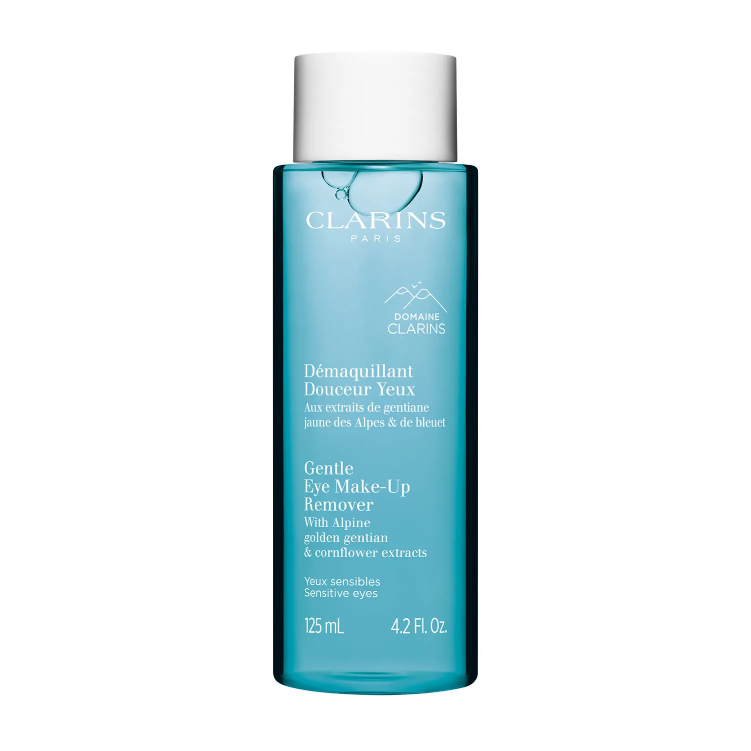 Средство специально создано для максимально бережного снятия макияжа с чувствительных глаз. Оно одновременно удаляет загрязнения и успокаивает кожу. Лосьон содержит органический экстракт горечавки, выращенной на собственном участке Domaine Clarins в Альпах, а также органический экстракт василька – обе вытяжки успокаивают нежную кожу век.
