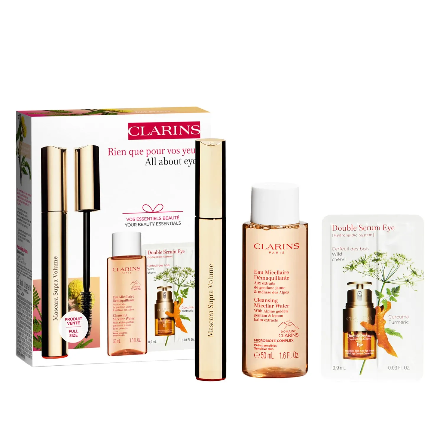 В этом наборе собраны все необходимое для создания сияющего, юного взгляда. Двойная сыворотка для кожи вокруг глаз Double Serum Eye содержит растительные экстракты, обладающие комплексным омолаживающим действием. Мицеллярная вода для чувствительной кожи Eau Micellaire Demaquillante позволяет быстро очистить кожу от макияжа и загрязнений, не нарушая баланс ее микрофлоры. Тушь для ресниц Mascara Supra Volume позволяет создавать выразительный макияж и стимулирует естественное увеличение объема ресниц.