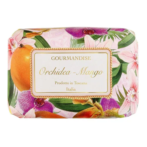 Натуральное парфюмированное мыло с неповторимым ароматом спелого манго и нежной орхидеи сварено вручную по традиционным итальянским рецептам. Утонченный аромат обрамляет изысканная упаковка. Произведено в самом сердце Тосканы - прекрасной Флоренции. Более 97% натуральных ингредиентов. Активные компоненты : • Мыльная база - 100% растительного происхождения, на основе пальмового и кокосового масел высокого качества, а благодаря производству на уникальном оборудовании полезные свойства, минералы и витамины не вымываются и сохраняют формулу мыла обогащенной и абсолютно не сушащей кожу, 200 г