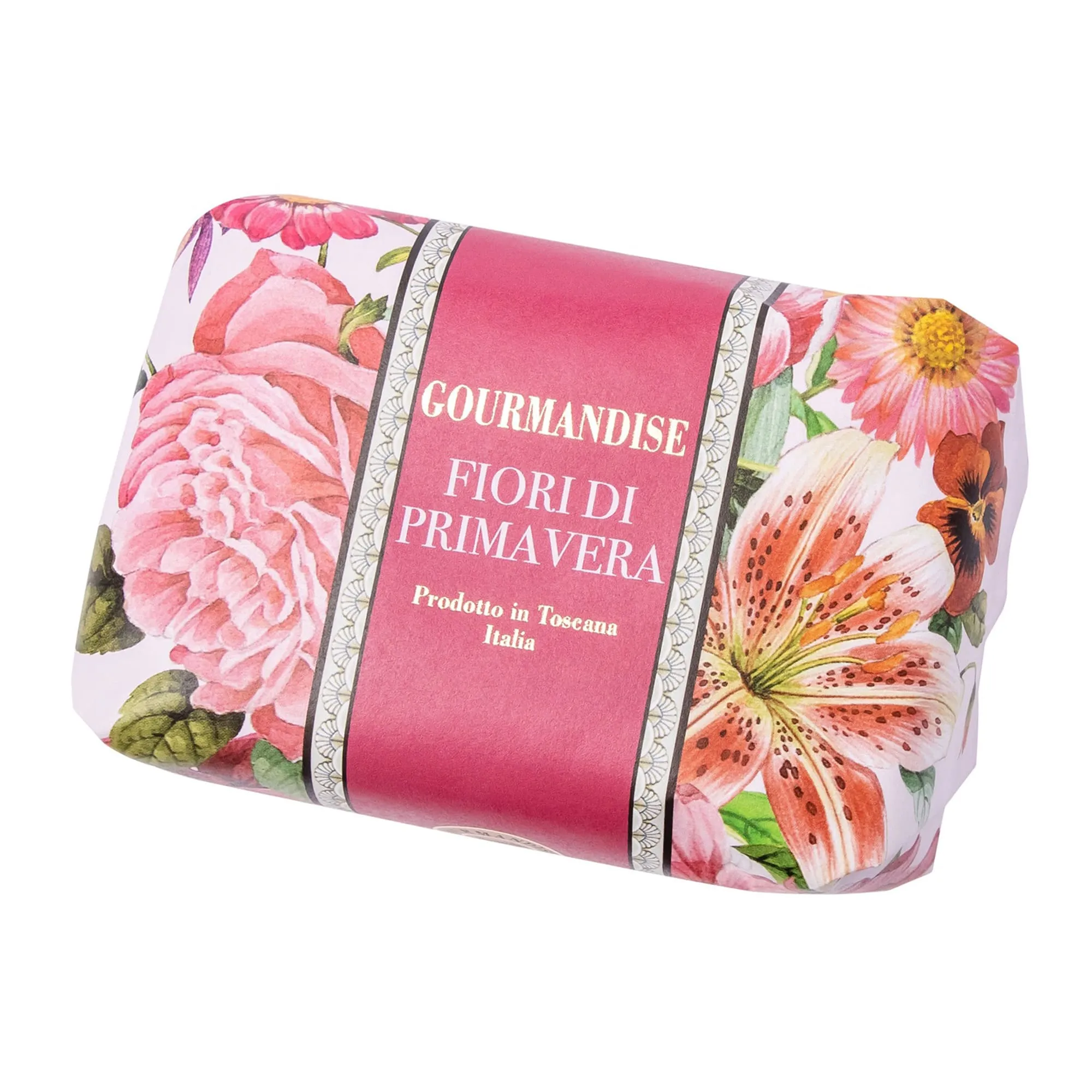 Натуральное парфюмированное мыло с окутывающим ароматом весенних цветов сварено вручную по традиционным итальянским рецептам. Утонченный аромат обрамляет изысканная упаковка. Произведено в самом сердце Тосканы - прекрасной Флоренции. Более 97% натуральных ингредиентов. Активные компоненты : • Мыльная база - 100% растительного происхождения, на основе пальмового и кокосового масел высокого качества, а благодаря производству на уникальном оборудовании полезные свойства, минералы и витамины не вымываются и сохраняют формулу мыла обогащенной и абсолютно не сушащей кожу.