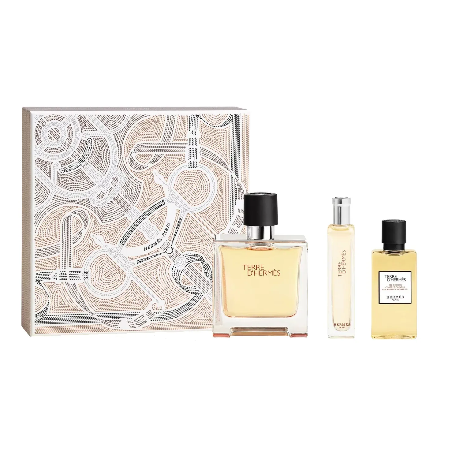 "Набор Terre d'Hermès включает духи (75 мл + 15 мл), гель для душа для тела и волос (40 мл).