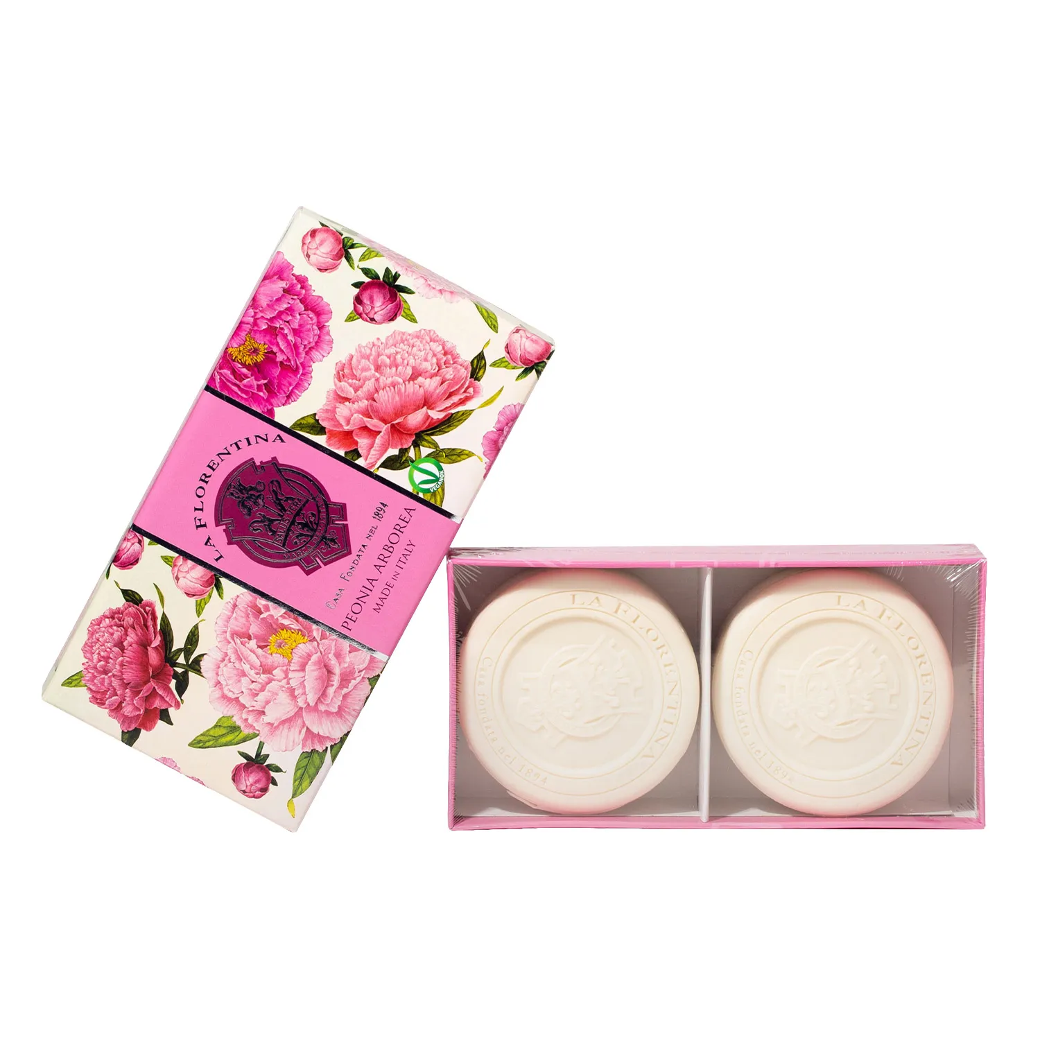 Мыло La Florentina - это палитра потрясающих ароматов Италии, способная создавать настроение. Два фирменных кусочка мыла из коллекции “Изысканный Пион”, украшенные гербовой печатью и бережно упакованные в роскошную красочную коробочку станут отличным подарком для любимых, украсят Ваш дом и наполнят его чарующим, благородным ароматом едва распустившихся после весеннего ливня пионов.