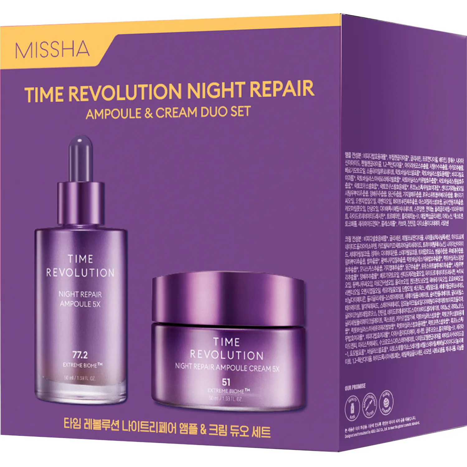 Набор для ухода за кожей лица MISSHA Time Revolution Night Repair – два уходовых средства для комплексного восстановления, омоложения и питания зрелой кожи, которые эффективно дополняют и взаимно усиливают друг друга. Антивозрастная сыворотка MISSHA Time Revolution Night Repair Ampoule 5X – концентрированное средство на водной основе, которое встраивают в цикл ежедневного ухода за кожей после очищения и перед нанесением крема для лица. Антивозрастной крем с лифтинг-эффектом MISSHA Time Revolution Night Repair Ampoule Cream 5X, который идеально подходит для завершающего этапа дневного и ночного ухода за кожей. Клинически доказано, что омолаживающие средства MISSHA Time Revolution Night Repair эффективно работают над 10 признаками возрастных изменений кожи. Сокращаются мимические морщины, улучшается текстура кожи, повышается плотность и эластичность эпидермиса, активизируются процессы обновления клеток, устраняются следы усталости и воспалений, кожа увлажняется, подтягивается и приобретает естественное сияние. В основе восстанавливающих продуктов MISSHA серии Time Revolution Night Repair используется запатентованный высококонцентрированный компонент EXTREME BIOME™ – микс лизата бифидобактерий и 10 видов пробиотиков. Благодаря EXTREME BIOME™ усиливается клеточный иммунитет кожи и повышаются защитные функции эпидермиса, поддерживается комфортный уровень увлажнения и регенерируются ткани. Собственная технология микроабсорбции MISSHA PRO FERMENT α™ позволяет действующим компонентам косметических средств легче, быстрее и глубже проникать во все слои кожи. Омолаживающие продукты с эффектом лифтинга MISSHA Time Revolution Night Repair подходят для всех типов кожи, включая чувствительную, зрелую и обезвоженную. Выбирайте для себя или в подарок близким лучшее из корейской косметики для лица и экономьте на приобретении двух незаменимых уходовых средств в одном наборе Missha Time Revolution Night Repair.