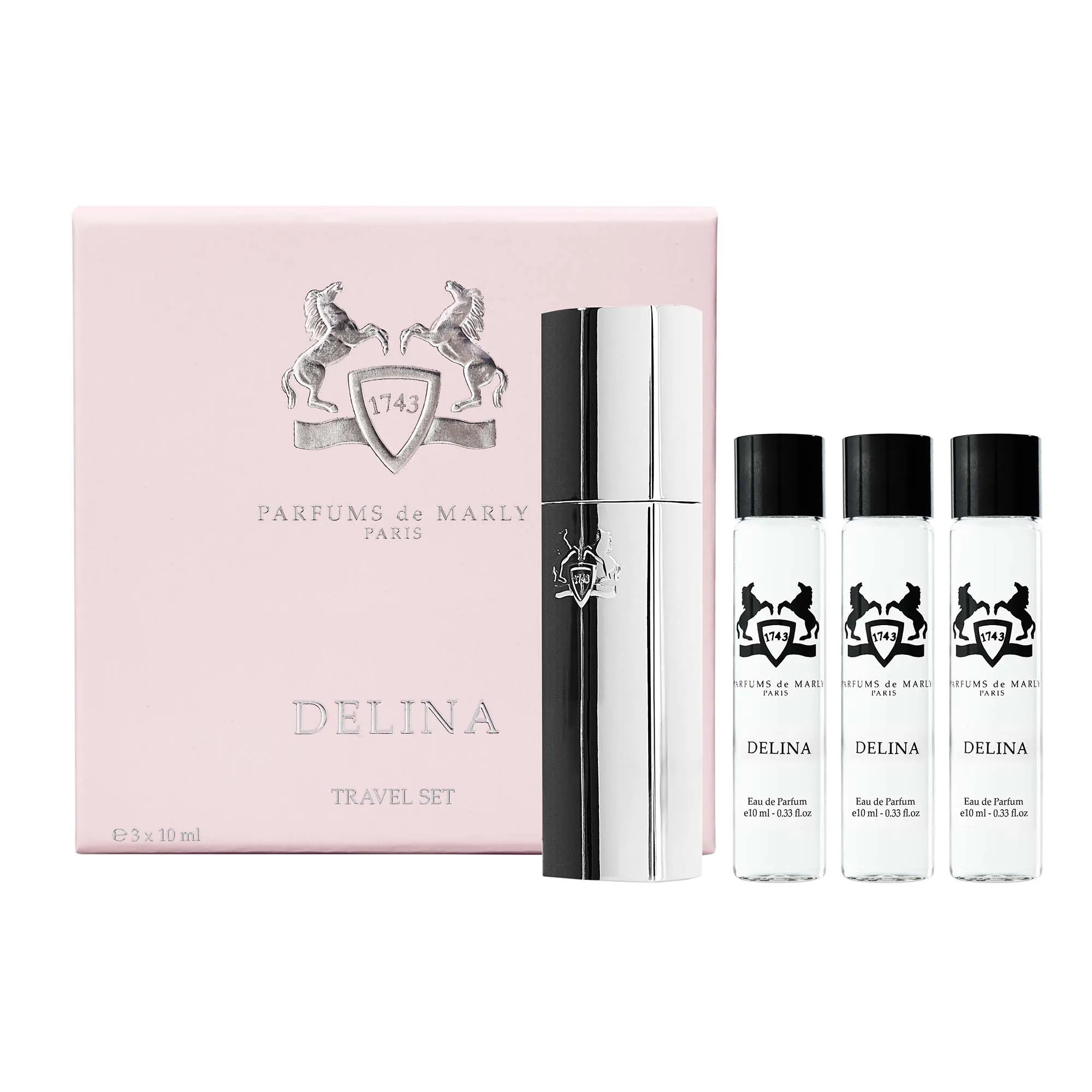 Дорожный набор состоит из трех атомайзеров с ароматом Delina и тревел кейсом. Цветочный женственный аромат Delina открывается фруктовым свежим аккордом, состоящим из цитрусовой, сладкой и горьковато-зеленой ноты, к которым примешивается мускатный орех. В сердце турецкая роза соединяется с нежным пионом. В базе аромата собран богатый древесных аккорд, оттеняет который протяжный, бальзамический ладан.