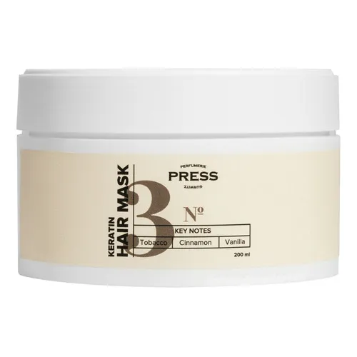 Кератиновая маска Press Gurwitz Perfumerie интенсивно питает и восстанавливает сухие и поврежденные волосы, возвращает силу и укрепляет от корней до кончиков. Кератин проникает в структуру волос, насыщает их необходимыми микроэлементами, возвращает блеск, мягкость и гладкость, облегчает расчёсывание. Маска оставляет на волосах роскошный аромат с нотами табака, ванили и корицы. Без сульфатов и парабенов, не тестируется на животных.