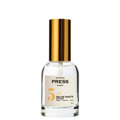 Туалетная вода Press Gurwitz Perfumie №5 c нотами имбиря, вербены и ванили. Взрывной букет свежих и сладких нот аромата открывается летучей кислинкой вербены, вступающую в игру с нотами имбиря и обогащенный гурманскими нотами ванили.