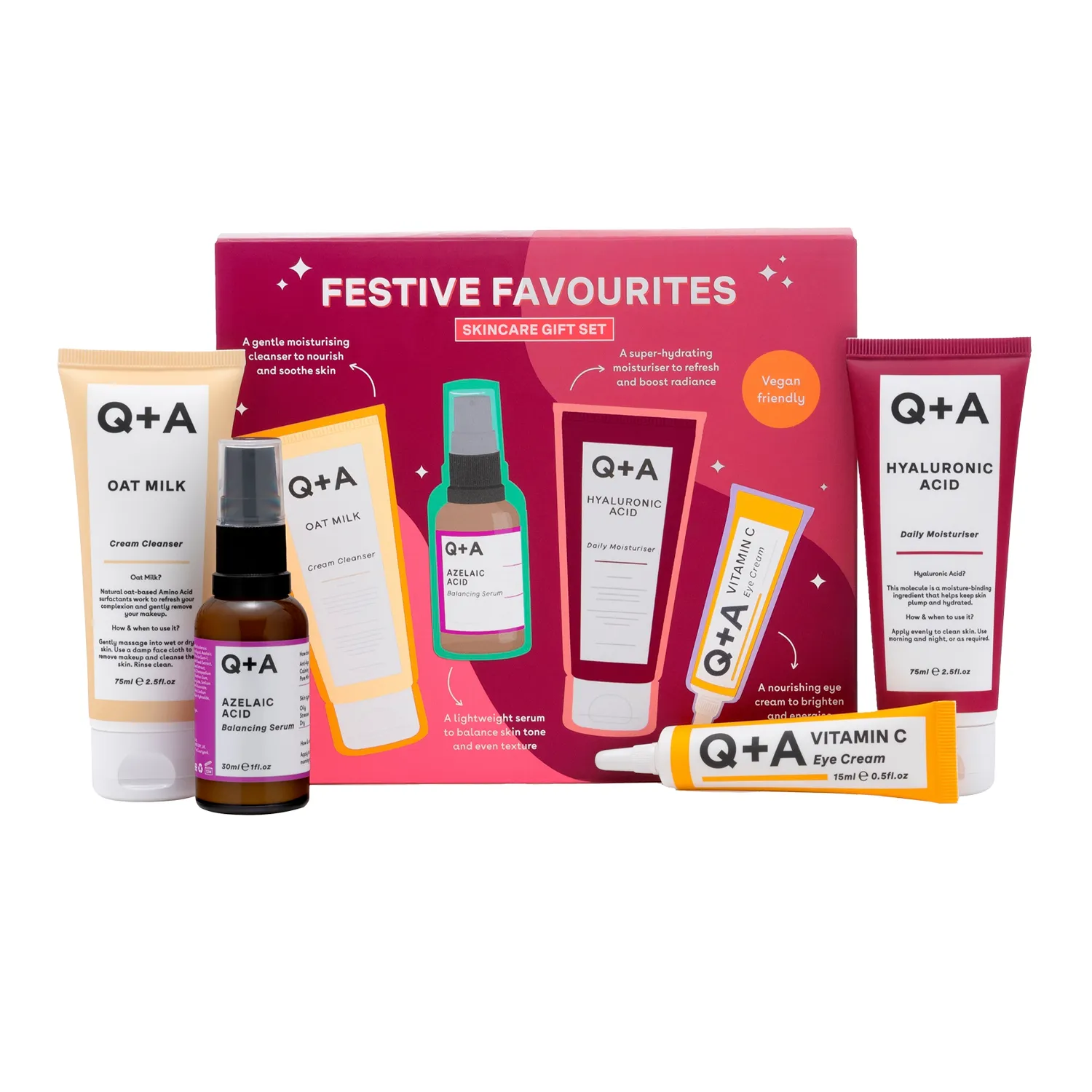 Подарочный набор средств для ухода за кожей Q+A Festive Favourites включает все необходимое для комплексного ухода за лицом. В набор вошли четыре бестселлера бренда, направленные на питание, балансирование, увлажнение и тонизирование кожи — идеальный выбор как для начинающих, так и для экспертов. Внутри: