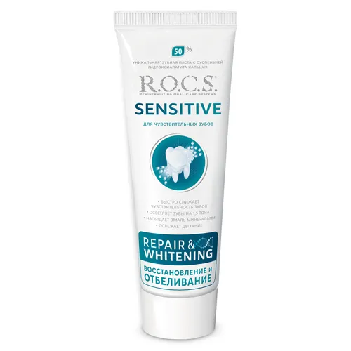 Зубная паста R.O.C.S. SENSITIVE «Repair & Whitening» рекомендована всем лицам, страдающим симптомами повышенной чувствительности зубов. Независимо от причин возникновения нежелательной симптоматики (будь то возрастные изменения, трещины и сколы эмали, пародонтит, кариес, беременность, особенности диеты, следствие воздействия агрессивных веществ или иное) паста для чувствительных зубов R.O.C.S. SENSITIVE «Восстановление и Отбеливание» значительно облегчит неприятные ощущения уже после первого применения.